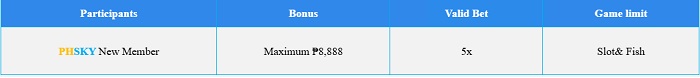 PHSKY has just launched a new welcome event for first-time players. The headline offer is a random bonus of up to ₱8,888, but the real selling point is the exceptionally low 5x wagering requirement.